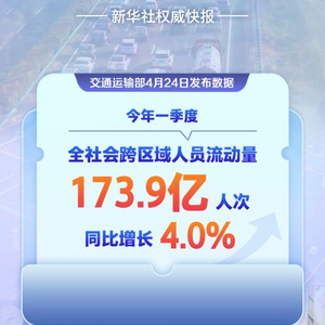 173.9亿人次!今年一季度我国交通出行火热 昆明信息港 昆明信息港官方账号 2025.04.2410:26 关注 4月24日,交通运输部发布数据,2025年一季度,全社会跨区域人员流动量为173.9亿人次,同比增长4.0%,全社会跨区域人员流动持续旺盛。
