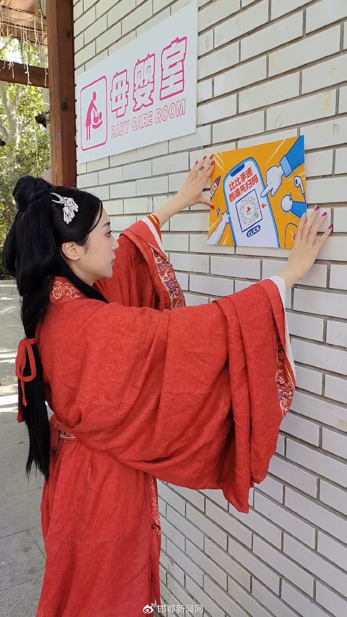 工作人员正在丛台公园、广府古城、邯郸道历史文化街区张贴“一部手机游邯郸”文旅数字服务平台二维码