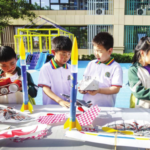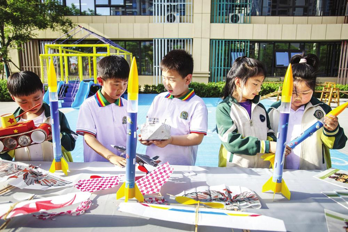 今天是中国航天日。4月23日,复兴区八一小学举办了以“海上生明月,九天揽星河”为主题的航天日活动。图为孩子们在研究火箭、坦克和舰船的功能。 通讯员聂长青 摄