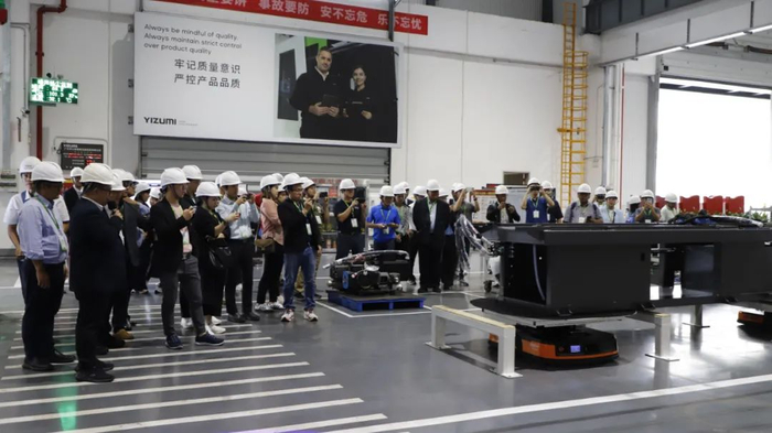 代表团抵达伊之密的第三工厂。该工厂的智能物料运输系统和数字孪生管理平台正在实时交互,展现出全流水线生产模式精准的调度能力,让参观者们不断驻足观看。