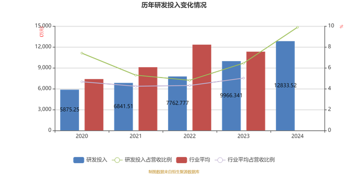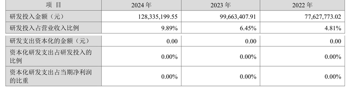 2024年全年,公司研发投入金额为1.28亿元,同比增长28.77%;研发投入占营业收入比例为9.89%,相比上年同期上升3.44个百分点。此外,公司全年研发投入资本化率为0%。