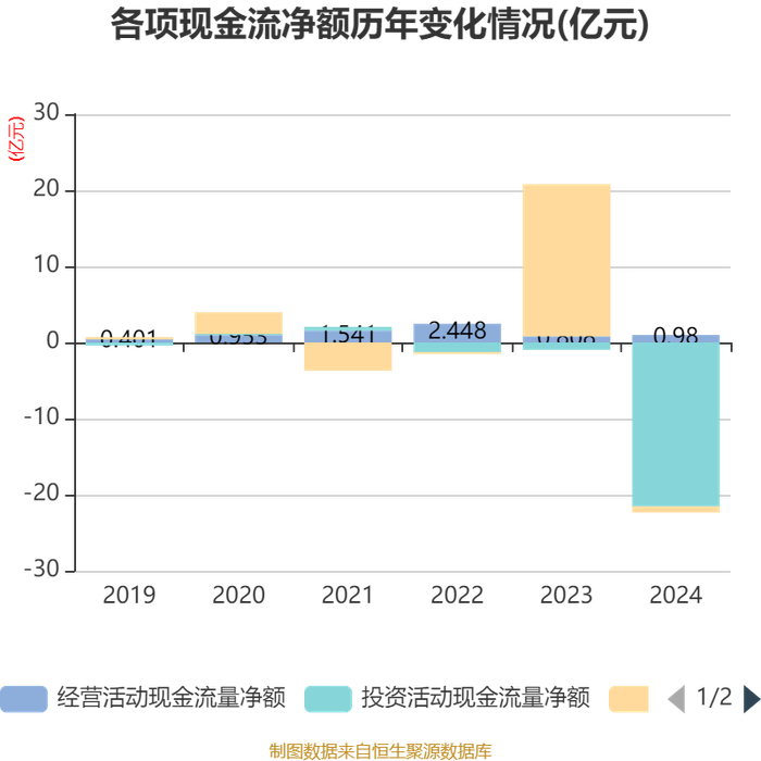 截至2024年,公司经营活动现金流净额为9803.65万元,同比增长21.34%;筹资活动现金流净额-7832.14万元,同比减少20.77亿元;投资活动现金流净额-21.55亿元,上年同期为-9672.52万元。