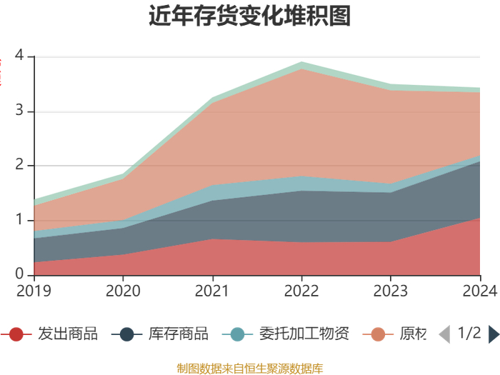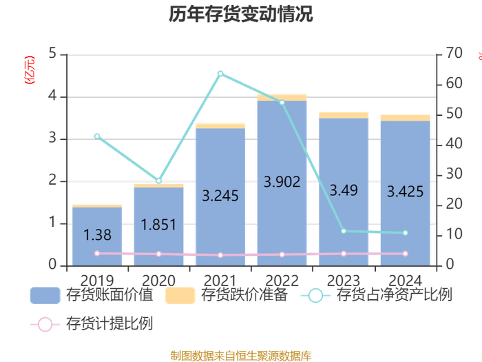 从存货变动来看,截至2024年末,公司存货账面价值为3.42亿元,占净资产的10.81%,较上年末减少655.21万元。其中,存货跌价准备为1395.34万元,计提比例为3.91%。