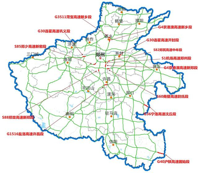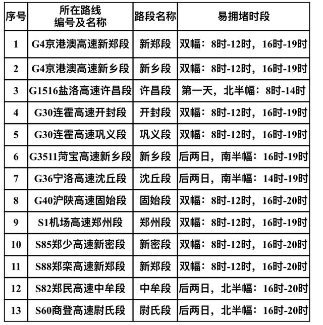 预测可能出现拥堵的路段有:机场高速郑州段、京港澳高速新郑段、京港澳高新乡段、连霍高速开封段、郑少高速新密段、郑民高速中牟段等。