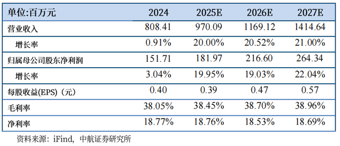 我们预计公司2025-2027年的营业收入分别为9.70亿元、11.69亿元和14.15亿元,归母净利润分别为1.82亿元、2.17亿元和2.64亿元,EPS分别为0.39元、0.47元和0.57元,我们给予“买入”评级,目标价24元,对应2025-2027年预测EPS的62倍、51倍及42倍PE。