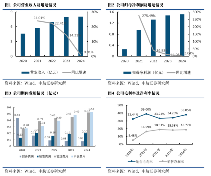 2024年,公司毛利率(38.05%,+3.85pcts)增长较多,而净利率(18.77%,+0.39pcts) 小幅增长,我们认为主要系期间费用率(16.40%,+1.25pcts)有所增长,以及公司计提的资产减值损失(-0.11亿元,+126.02%)和信用减值损失(-0.13亿元,+297.30%)增加所致。