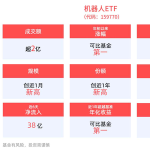 机器人ETF(159770)紧密跟踪中证机器人指数。最新规模达51.12亿元,最新份额达59.04亿份,均创上市以来新高。年初以来份额增长41.43亿份,份额变动率超235%,位居可比基金1/6。