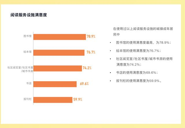 在使用过以上阅读服务设施的城镇成年居民中,图书馆的使用满意度最高,为78.9%;绘本馆的使用满意度为76.7%;社区阅览室/社区书屋/城市书房的使用满意度为74.2%;书店的使用满意度为69.6%;报刊栏的使用满意度为59.9%。
