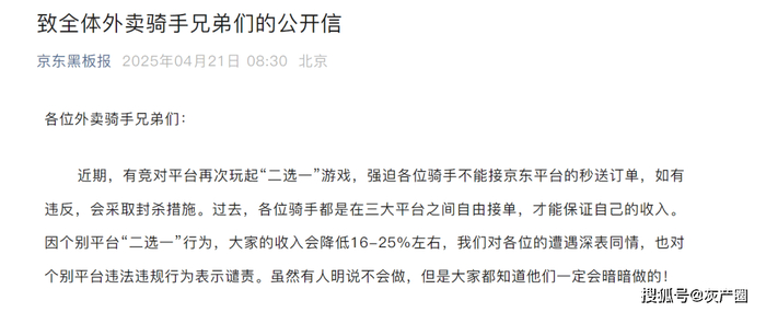 先是京东官方发布了一封致全体外卖骑手的公开信。
