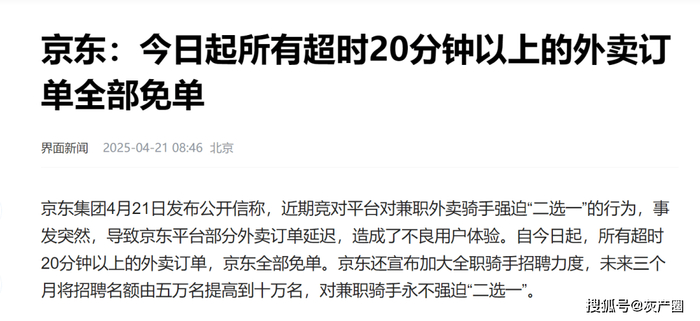 此外,京东还宣布,对与超时20分钟以上外卖的订单全部免单。