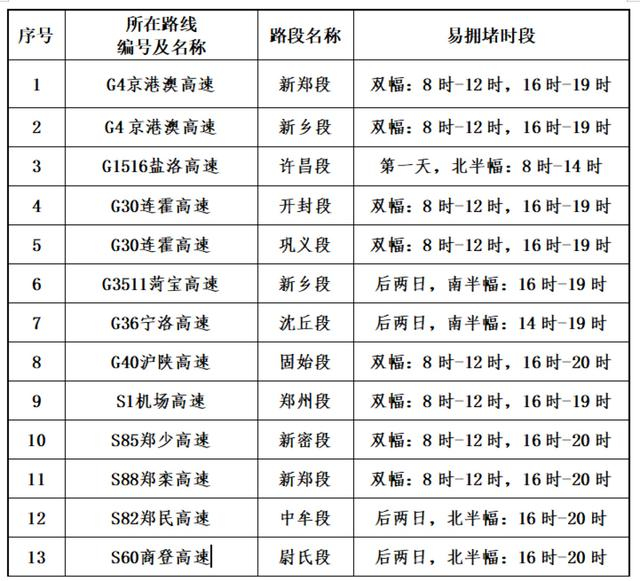 预测可能出现拥堵的路段有:机场高速郑州段、京港澳高速新郑段、京港澳高速新乡段、连霍高速开封段、郑少高速新密段、郑民高速中牟段等。