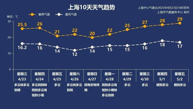 今天上海白天云系增多,多云到阴为主,傍晚到夜间转阴到多云有短时小雨,雨势较弱,对出行影响不大。气温总体跟昨天相当,全天在16-26度之间,体感舒适宜人。偏南风3-4级,中午转偏北风4-5级,相对湿度95%-40%。明天天空状况转好,会有两天的多云天气。受冷空气扩散影响,明天气温下降,最高气温降至21度,周六早间最低气温仅12度。周日到下周一,上海还将有一次降水过程,之后转为多云为主的天气,气温逐日上升。