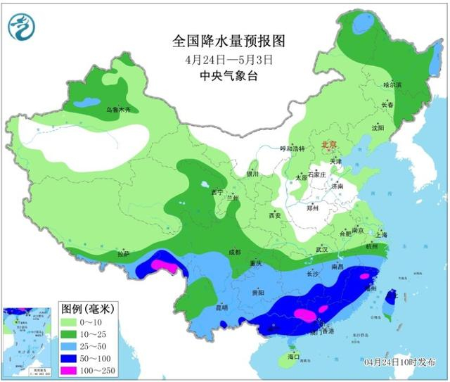 据中国天气网中期天气预报,未来10天(4月24日-5月3日),江南、华南等地多降雨过程,并伴有短时强降水、雷暴大风等强对流天气,主要降雨时段在24-25日、26-27日及30日前后。