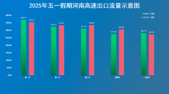 高速公路运行趋势预测:2025年五一小长假共5天,预计探亲流、旅游流、学生流仍将“三流叠加”,中、短途自驾出行依旧是主要出行方式。参考近年来五一假期高速公路流量数据及出行趋势,预计今年五一期间,全省高速公路出口总流量将达到1600万辆左右,较2024年同比增长2.42%,日均约320万辆,是日常日均流量的2.05倍,5月1日单日流量将攀升至峰值,预计达到353.73万辆。