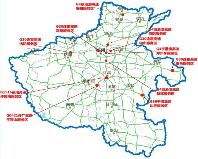 郑州服务区、郑州东服务区、平顶山服务区、许昌南服务区、洛阳服务区、安阳服务区、原阳服务区等。