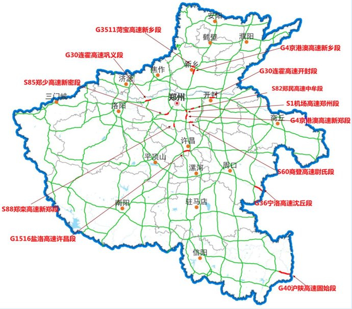机场高速郑州段、京港澳高速新郑段、京港澳高速新乡段、连霍高速开封段、郑少高速新密段、郑民高速中牟段等。
