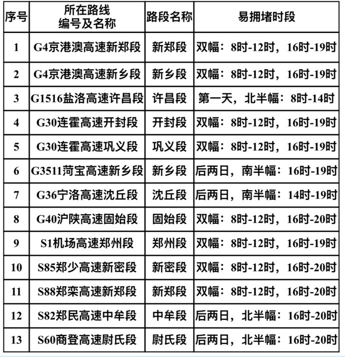 时段二:避开假期最后一天下午返程高峰时段,提前返程、错峰返程。假期最后一天(5月5日)下午返程的要特别注意,16时以后返郑下站车辆骤增,下高速后进入市区道路极易拥堵,建议提前返程,错峰返程,同时避开易堵高速下站口。