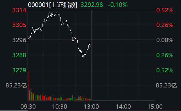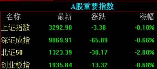 上证指数报3292.98点,跌0.1%,深成指报9869.92点,跌0.66%,创业板指报1936.18点,跌0.67%。