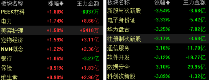 次新股、算力、AI应用、光刻机、光伏、消费电子题材跌幅靠前;电力、医药、银行走强,宠物经济、PEEK材料概念股活跃。