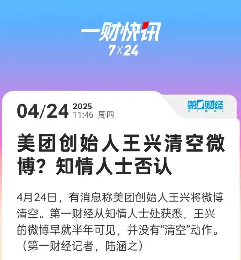 4月24日,据第一财经记者消息,王兴的微博早就半年可见,并没有“清空”动作。