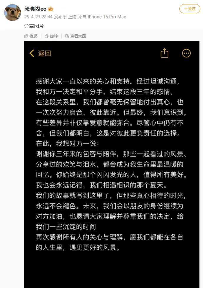4月23日晚,恋综《心动的信号》第五季嘉宾郭浩然、李宛倩发文,宣布“六万CP”分手的消息。