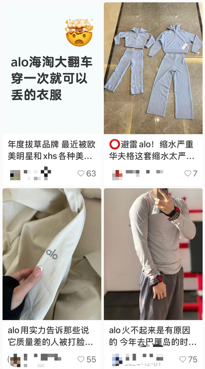 尽管Alo尚未正式进入中国,但其产品已通过代购、跨境电商等渠道流入国内市场。在小红书、微博等社交平台上,不少消费者反映,市场上流通的Alo产品“高仿众多”,且正品“面料体验参差不齐”。有用户吐槽:“Alo的裤子价格接近Lululemon,但透气性和延展性明显逊色,性价比不高。”