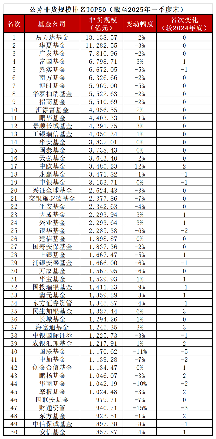 随着公募基金一季报披露完毕,各大公募最新非货规模座次再迎洗牌。