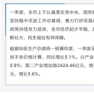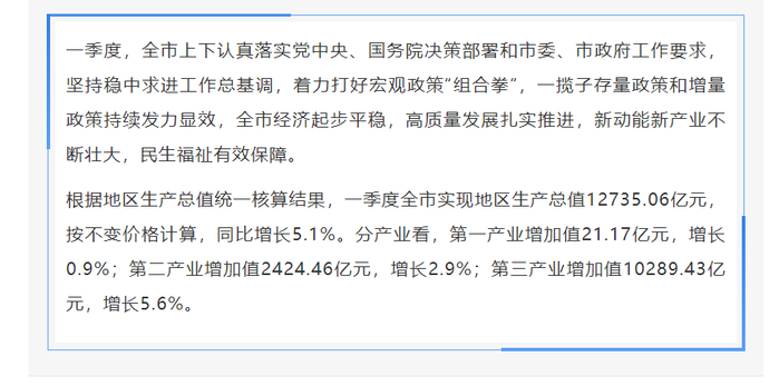 看看宏观数据,一季度GDP12735.06亿元,同比增长5.1%,高于去年全年和去年第一季度0.1个百分点。同时,全市居民消费价格指数(CPI)同比上涨0.1%,新增就业人数14.63万人,同比增加0.76万人。物价和就业都保持稳定。