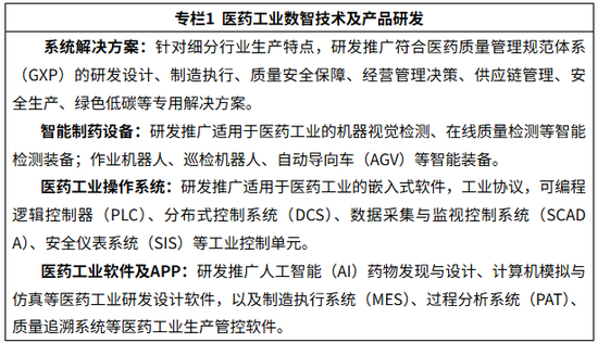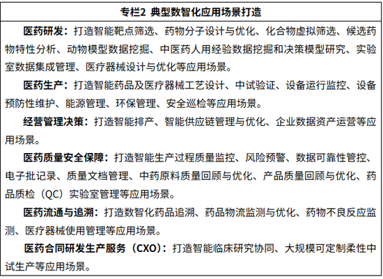 1.推广典型数智技术应用卓越场景。围绕医药研发、医药生产、经营管理决策、医药质量安全保障、医药流通与追溯、医药合同研发生产服务(CXO)等方面,系统梳理数智化转型场景清单,以及数据要素、知识模型、工具软件、人才技能等要素清单,支持医药企业和信息技术服务企业联合打造数智化应用场景,系统化推进医药企业数智化转型。