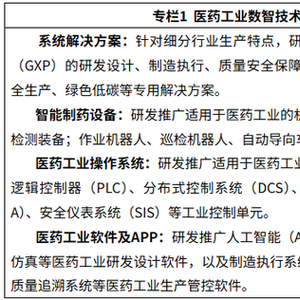 1.加强医药工业数智产品研发应用。组织医药数智化系统解决方案及技术产品“揭榜”攻关,针对化学药、中药、生物制品、医疗器械等细分行业生产特点,打造符合医药质量管理规范体系(GXP)的系统解决方案,研发推广一批智能制药设备、检测设备,开发一批“小快轻准”医药工业软件或系统等。支持创建医药工业数智技术应用验证与中试平台,集成推进共性技术攻关、软硬件适配验证测试、计算机化系统验证(CSV)等技术服务。