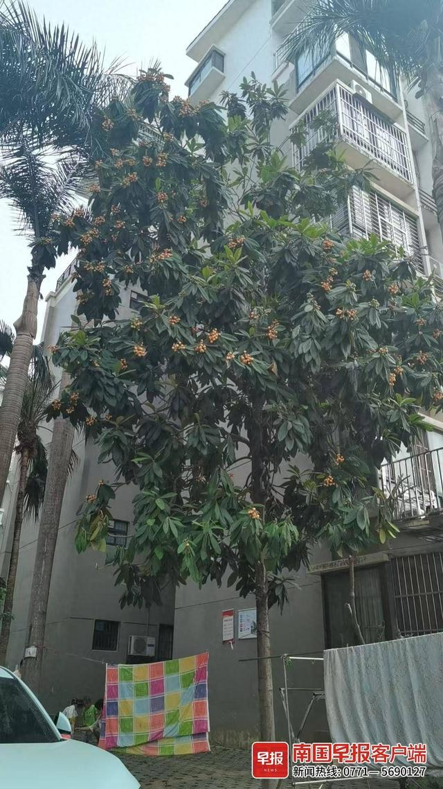 澳海蓝湾小区,一棵枇杷树有四五层楼高,结了不少果实。