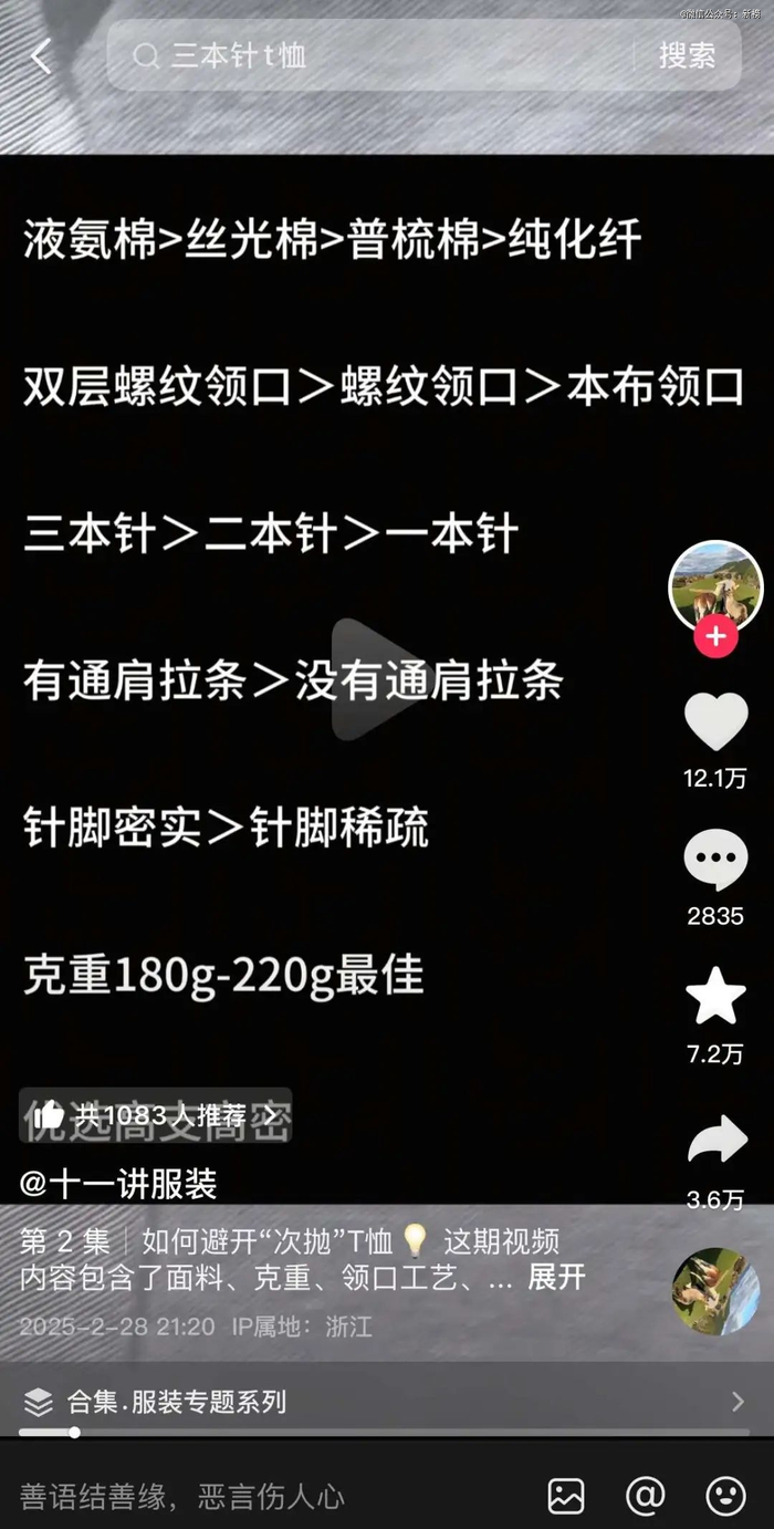 他们大多是拥有多年经验的服饰从业者,镜头直接对准衣服本身,输出对面料成分、版型剪裁的专业分析,便收获几十万乃至上百万的点赞量,成功闯出一条“服饰成分党”赛道。