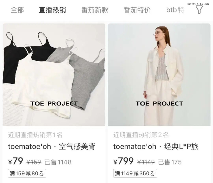 寻求差异化优势。以女装品牌toematoe'oh为例,其在“Tina面料测评”小红书直播间热销*的单品为79元背心,而这款在淘宝店铺并未上架。
