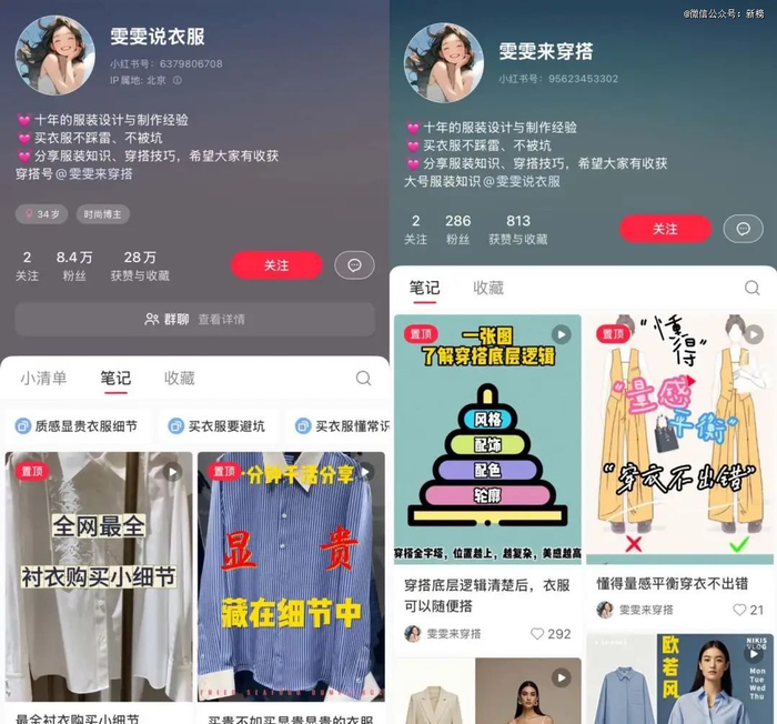 在“服装成分党”赛道,有博主不仅讲解买衣服的干货,还运营了穿搭,做到一条龙服务,比如在小红书有8.3万粉丝的“雯雯说衣服”。
