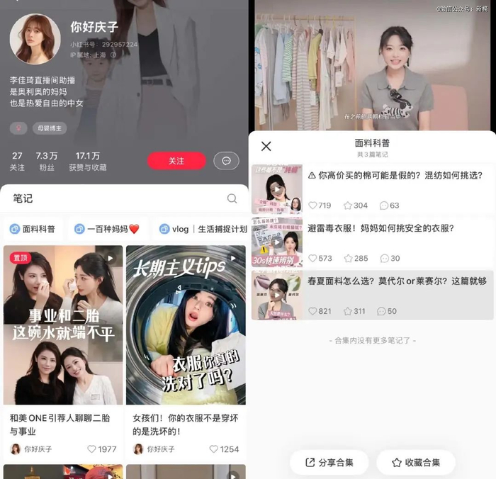 今年3月,李佳琦直播间的助播庆子在自己的小红书账号中开辟了“面料科普”专栏,向粉丝科普棉和混纺的区别,教大家如何看领标、水洗标和吊牌等衣服的“身份证”,单篇笔记最高获赞821个。