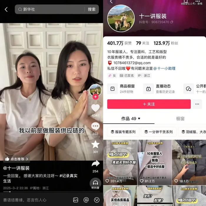 “十一讲服装”账号的主理人十一和娇娇曾在视频中分享,两人都是服饰行业的从业者,很容易看出一件衣服的质量高低。