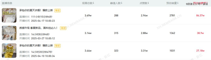 从带货主题来看,两位博主都是围绕春夏服饰上新展开,推崇“日常穿出高级感”“服饰质感是关键”的消费理念。直播间上架的服饰多是设计简约的基础耐穿款,注重介绍天丝、亚麻等面料细节,单品价格从百元至千元均有覆盖。