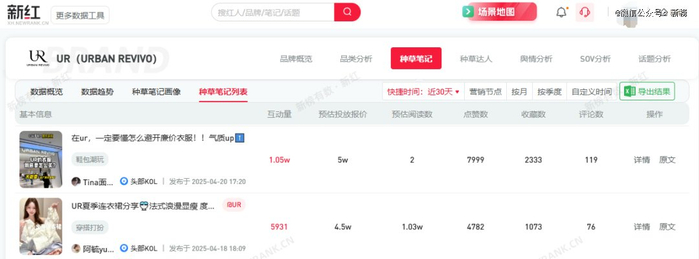 以UR为例,新红数据显示近30天内,UR累计在小红书发布了4051篇种草笔记,累计互动量(点赞+收藏+评论)达到25.19万。