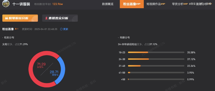 新榜旗下抖音数据工具新抖显示,“十一讲服装”的粉丝画像中,71.3%为女性,年龄分布以24-30岁为主,占比37.1%。