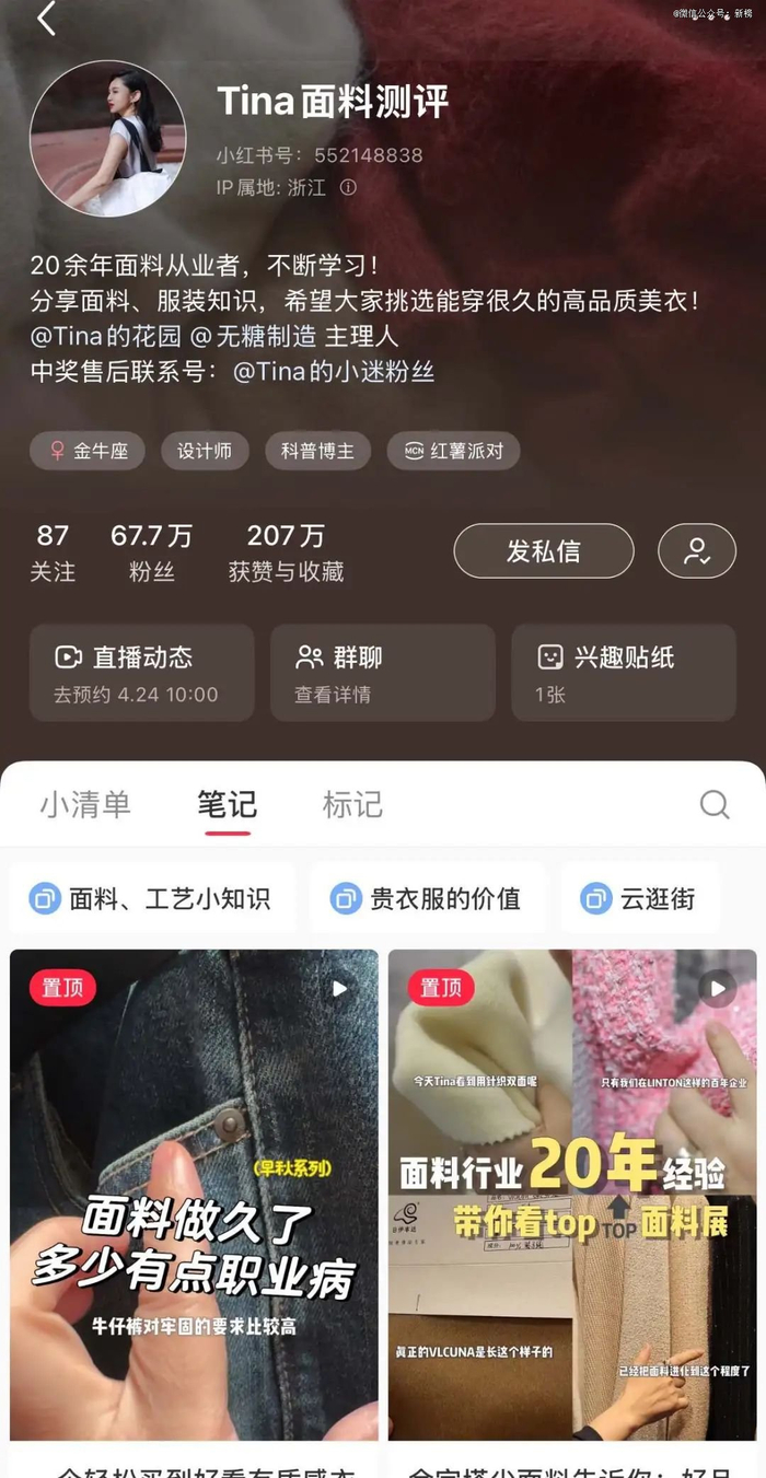 目前,“Tina面料测评”在全网拥有超146万的粉丝,仅小红书平台的粉丝量就达到了67.7万。