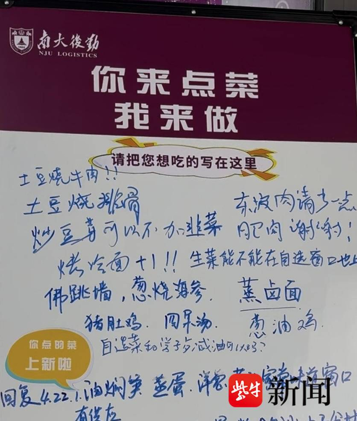近日,南京大学食堂“你来点菜我来做”留言板在社交平台走红。“留下您想吃的菜,我们会选择表态最高的菜品,不定时上新。”留言板上,分别设有点菜区和回复区,学生可以在点菜区写上自己想吃的菜,食堂则会在回复区对学生留言进行回应。