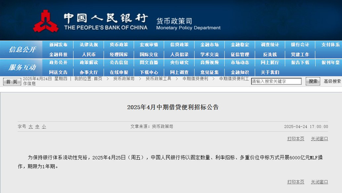 为保持银行体系流动性充裕,2025年4月25日(周五),中国人民银行将以固定数量、利率招标、多重价位中标方式开展6000亿元MLF操作,期限为1年期。