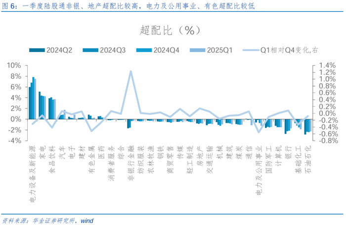 行业来看,一季度汽车、电子持仓规模上升,电新、家电超配比较高。(1)持仓上:首先,2025年一季度(3月31日数据,下同)中信一级行业中陆股通持仓规模最大的行业分别是电力设备和新能源(占比13.19%,较上季度-0.33pcts,下同)、银行(10.17%,+0.32pcts)、电子(9.89%,+0.94pcts);其次,持仓规模上涨较多的行业是汽车(5.96%,+1.17pcts)、电子(9.89%,+0.94pcts),下降最多的行业是电力及公用事业(3.20%,-0.65pcts)、非银(6.30%,-0.55pcts)。(2)净流入上,因个股及行业陆股通资金流入数据暂停披露,我们通过剔除持仓的价格因素对净流入数据进行估算:一季度电子(+168.3亿)、汽车(+156.7亿)、机械(+70.4亿)外资流入较多,而电力及公用事业(-133.6亿)、通信(-78.0亿)、化工(-68.9亿)外资流出较多。(3)超配比上,根据全A行业自由流通市值的比例计算北上资金各行业超低配比例,得到:首先,一季度陆股通资金超配比最高的行业分别为电力设备及新能源(7.52%)、家电(4.25%)、食品饮料(3.71%),超配比最低的行业分别是石油石化(-2.26%)、基础化工(-1.86%)和银行(-1.70%);其次,超配比环比上升较多的行业是非银、房地产、传媒,分别上升1.23、0.14、0.13pcts,超配比下降最多的行业分别是电力及公用事业、有色金属、食品饮料,分别下降0.56、0.52、0.42pcts。