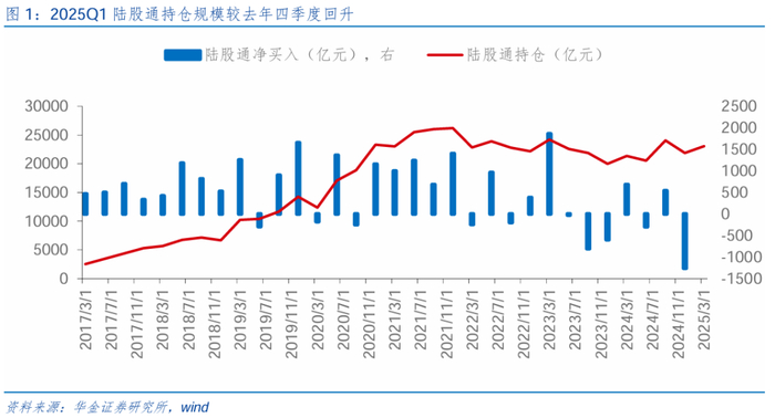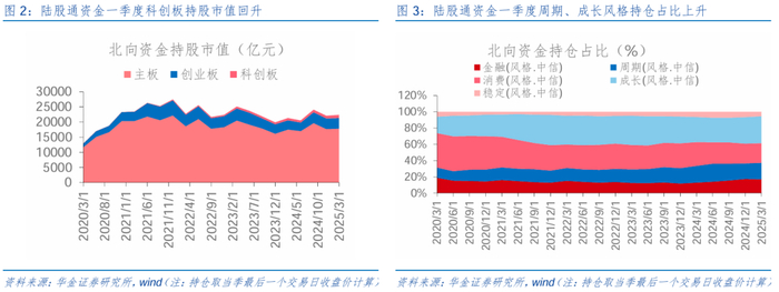 一季度陆股通持仓回升,主板持仓占比继续下滑,周期、成长板块持仓占比回升。首先,整体来看,2025年一季度陆股通持仓总规模达到2.30万亿元,较上季度环比增加1191.47亿元。其次,变化上:板块方面,2025Q1陆股通资金主板持仓占比较2024Q4继续下降0.5pcts,创业板下降0.12pcts,科创板上升0.62pcts;风格方面,2025Q1周期、成长陆股通资金持仓占比环比上升1.23pcts、0.55pcts,金融、消费、稳定风格分别下降0.41pcts、0.25pcts、1.12pcts。