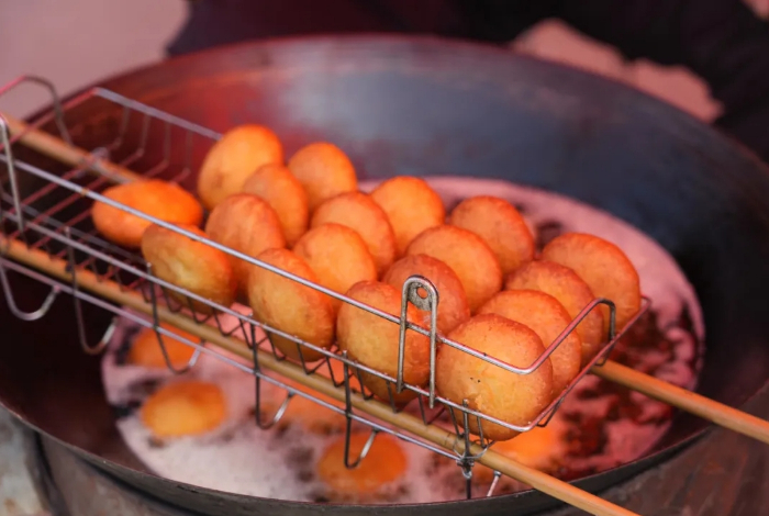 沿街道而设的美食摊位上,围满了前来品尝美食的游客,炸果子摊位上,面团在巧手拨弄下变换造型,油锅翻涌间绽放小麦酥香;特色小吃炸油糕,刚出锅就被一抢而空;洋芋搅团、豆花面、面皮等地道小吃,更让游客驻足流连。