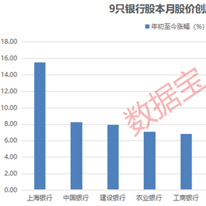 数据显示,本月以来股价突破历史新高的9只银行股中,5股属于国有大型银行,除工农中建四大行外,交通银行亦上榜。4股属于城商行,包括北京银行、上海银行、江苏银行、成都银行。创新高的银行股今年以来股价稳健上涨,上海银行年内涨幅达到15.52%,工农中建四大行年内涨幅均在6%以上。