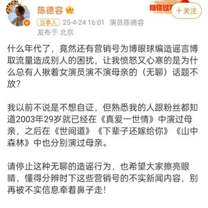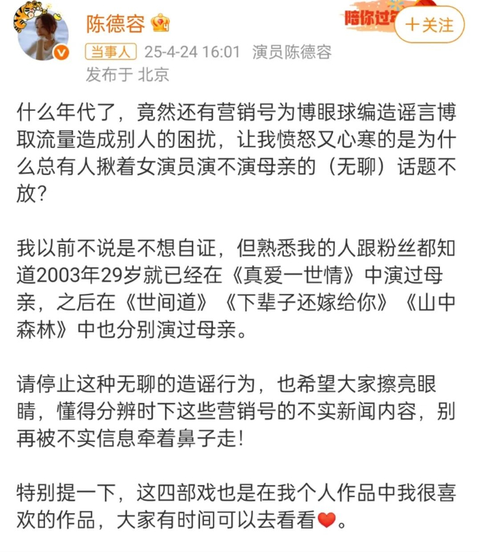 什么年代了,竟然还有营销号为博眼球编造谣言博取流量造成别人的困扰,让我愤怒又心寒的是为什么总有人揪着女演员演不演母亲的(无聊)话题不放?
