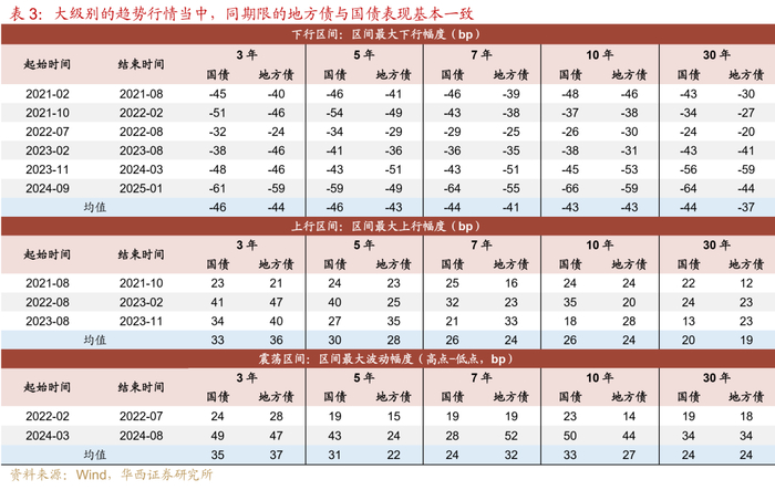 每一轮行情中,国债与地方债该如何选择?我们将2021年以来的债市行情划分为下行、上行、震荡三种状态(分别对应6段、3段、2段区间行情),计算各期限国债、地方债收益率在下行、上行、震荡时段中的区间最大下行幅度、最大上行幅度、最大波动幅度。