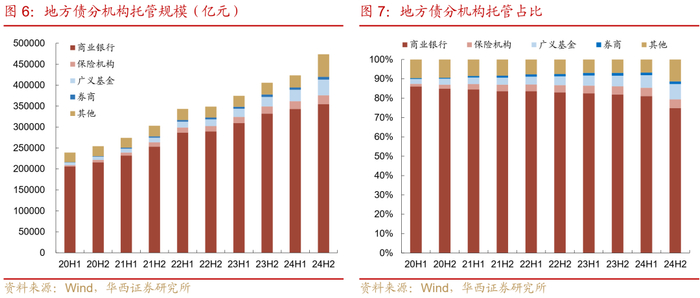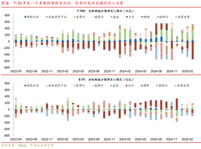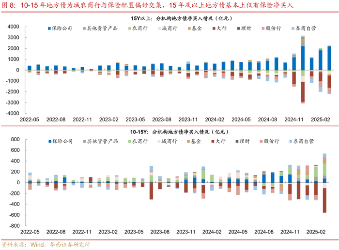 从趋势角度来看,近年来商业银行持有地方债占比持续小幅下降,而保险自营、广义基金和券商自营的持有占比在上升。具体而言,对比2020年2月末以及2025年2末的地方债托管结构,这五年的时间,商业银行的托管占比由85.4%下降至71.2%,降幅为14.3pct,与此同时,广义基金、保险自营、券商自营的占比增幅分别达到5.7pct、2.4pct、0.6pct,广义基金与保险自营成为地方债买盘扩散的重要力量。