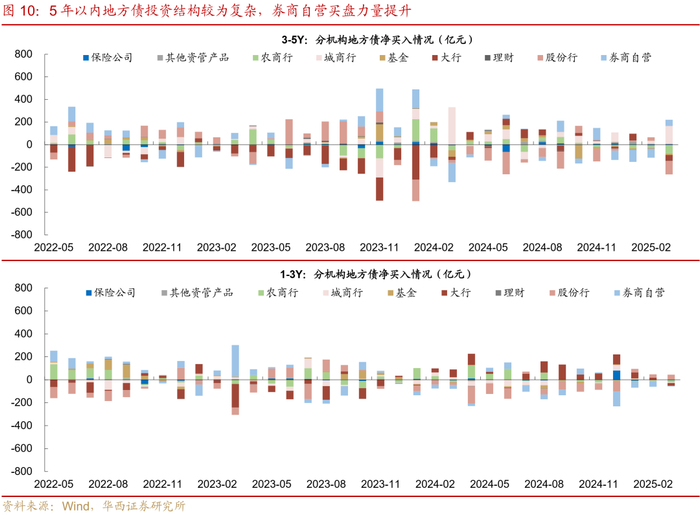 最后对于中短久期地方债,3-5年与1-3年的成交结构较为相似,除了银行之外,券商自营也是这一期限的主要买盘。对于券商自营而言,投资操作约束较少,更偏好高杠杆及波段交易,因此利率债是其核心投资品种。从托管数据来看,券商自营持有的国债、地方债在其持仓中所占的比重均为20%左右,在国债领域,券商日常主要在二级市场增持3-5年、5-7年、7-10年等中长期限品种;而在地方债领域其则对1-3年、3-5年品种的买入诉求相对更高。